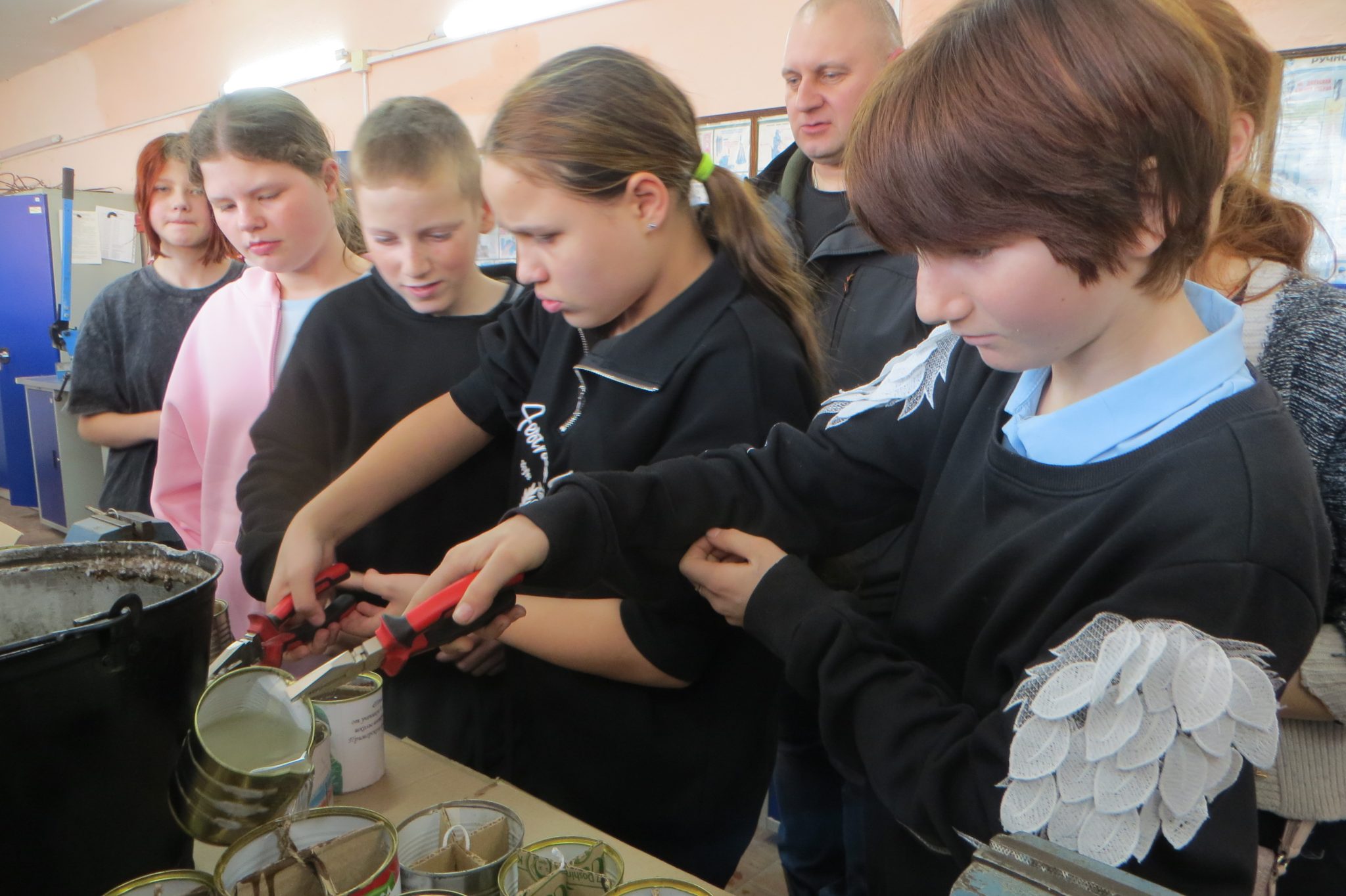 Виталий Витальевич и Арсений Витальевич подготовились к приходу школьников заранее — растопили для них парафин, разложили заготовки для свечей, которые ребята школы-интерната своими руками изготовили еще в прошлом году. Впрочем, и шестиклассники пришли не с пустыми руками. Девчонки и мальчишки такие же заготовки тоже принесли с собой. А затем по очереди, под наблюдением преподавателя и мастера, осторожно наполнили их растопленным парафином.