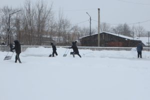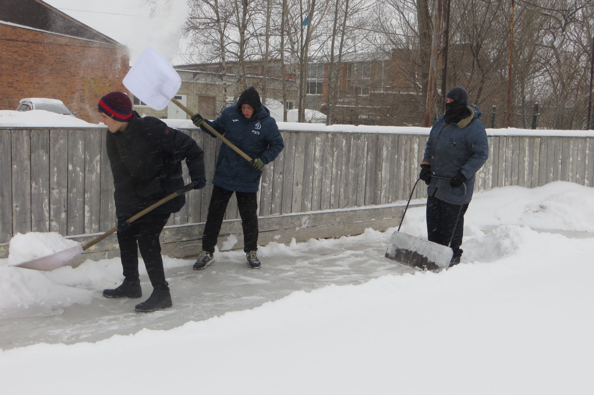 Несмотря на продолжающуюся второй день непогоду, студенты Черниговского сельскохозяйственного колледжа вместе с куратором Алексеем Владимировичем Дорошенко с раннего утра вышли на расчистку своего катка. Обильный снегопад, прошедший накануне, заставил их дружно взяться за лопаты.